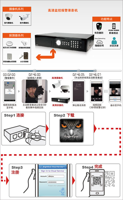 当侦测到人或者外接警报器被触发时,DVR 会即时在5 秒钟内传送监控影像到您的手机,并其中EagleEyes 软件,让您立即可观看到事件回放影片。