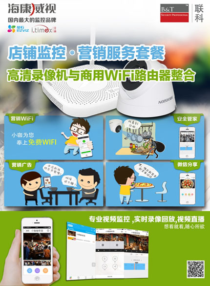 该方案搭配国内监控知名品牌"海康威视"产品—监控营销录像机 ,该产品具有高清监控,实时录像回放、视频直播、wifi 使用、广告推送、微信分享等各大功能,满足了店铺对于监控和营销产品的要求。创新的将高清监控功能整合商用wifi功能整合于一体。